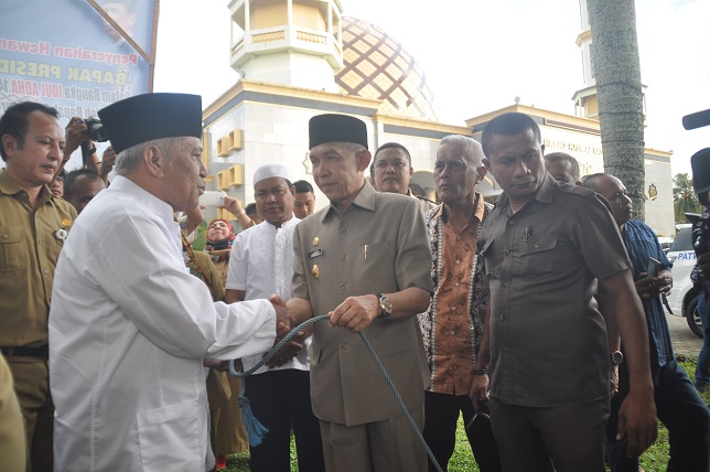 AMBON, – Gubernur Maluku Said Assagaff menyerahkan bantuan satu ekor sapi dari Presiden Joko Widodo kepada Masjid Raya Al Fatah Ambon. Bantuan hewan kurban dari Presiden Jokowi itu diterima oleh Imam Masjid Raya Al Fatah, Ustaz RR Hasanussi di pelataran masjid, Selasa (29/8/2017) pagi.