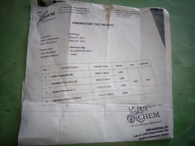 Data yang diperoleh Lembaga Kalesang Ligkungan Maluku dari KONTRAS menyebutkan, Kuku dari Fransina M nilai Hg-nya 1,4, Rambut dari Fransina M nilai Hg-nya 2,46, Kuku dari Petronela P nilai Hg-nya 0,28 dan Rambut dari Dorci Pookey nilai Hg-nya 8,93.