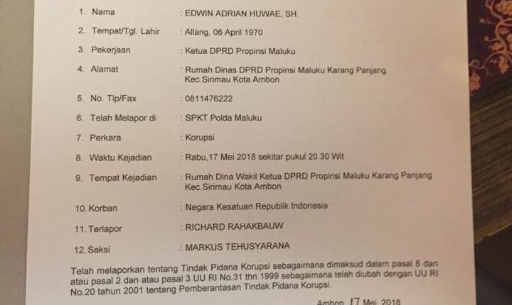 Selain laporan dugaan pencemaran nama baik, Huwae juga melaporkan Richard Rahakbauw atas dugaan penyalagunaan APBD Provinsi Maluku senilai Rp32,5 milyar dengan nomor laporan polisi LP-B/267/V/2018/MALUKU/SPKT.