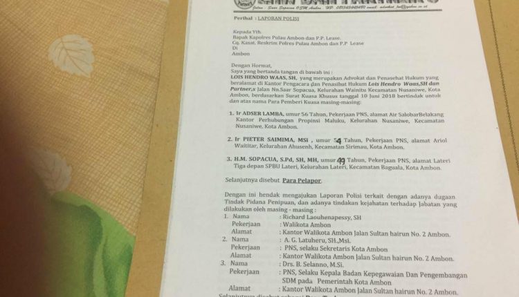 Tiga mantan pejabat eselon IIb, Ir Adres Lamba (mantan kepala Dinas Perpustakaan dan Kearsipan Kota Ambon), Ir Pieter Saimima MSi, (mantan Kepala Dinas Perhubungan Kota Ambon), dan H.M Sopacua Spd, SH, MH, (mantan Kadis Pariwisata Kota Ambon) resmi melaporkan Walikota Ambon, Richard Louhenapessy, Sekretaris Kota Ambon, AG Latuheru Msi dan Kepala Badan Kepegewaian dan Pengembangan SDM Pada Pemkot Ambon, Benny Selanno MSi di Polres Pulau Ambon & Pp Lease, Senin 11 Juni 2018 melalui kuasa hukumnya, Lois Hendro Waas SH & Patner’s.