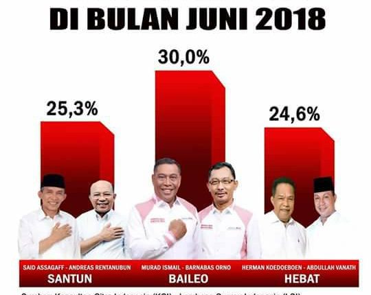 Yang menarik kata Ikrama, tracking survei yang dilakukan, terjadi tren suara fantastik terhadap pasangan nomor urut 2 yakni BAILEO. Yakni Mei 2017, elektabilitas personal Murad Ismail dari angka 0,5 persen meningkat di survei Oktober 2017 menjadi 9,3 persen.