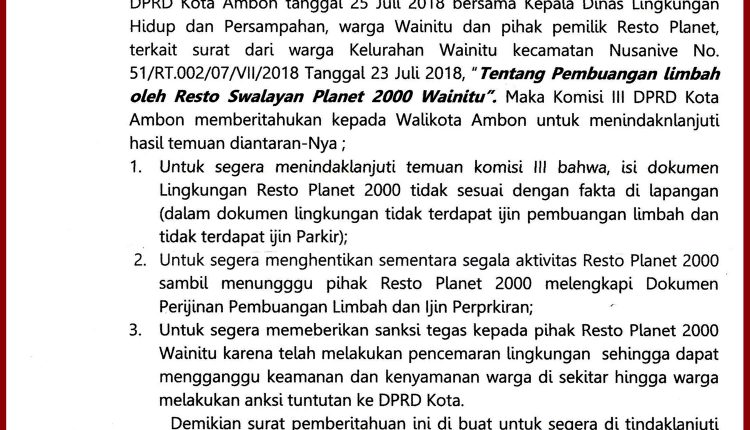 • 3.  Dan segera memberikan sanksi tegas kepada pihak resto planet 2000 Wainitu karena telah melakukan pencemaran lingkungan sehingga dapat mengganggu keamanan dan kenyamanan warga sekitar hingga warga melakukan aksi tuntutan ke DPRD Kota. (***)