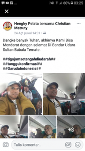 “Pesawat tidak bisa mendarat di Bandara Pattimura Ambon, lantaran cuaca buruk. Kita hampir tiga jam setengah diudara, dan pesawat kehabisan bahan bakar. Olehnya itu, maskapai mendarat di di Bandar Udara Internasional Sultan Babullah untuk pengisian bahan bakar,” ungkap Pelata.