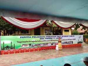 “Perayaan Idul Adha tahun ini, kita berkurban 12 Sapi dan 5 kambing. Hewan kurban ini merupakan sumbangan dari Wakil Ketua DPRD Kota Ambon, Rustam Latupono, orang tua murid, dewan guru, OSIS SMA Negeri 11 Ambon,” kata salah satu panitia dalam sambutannya.