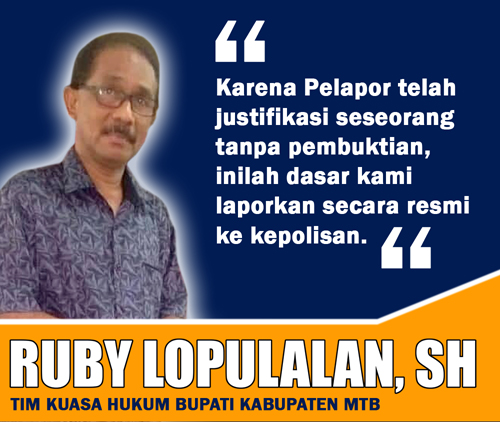 “Bupati MTB sampai hari ini belum ada putusan pengadilan dan terbukti melakukan tindak pidana Korupsi dan penyalagunaan wewenang, sementara beliau sudah dituduh melakukan korupsi. Tentunya ini adalah sebuah pencemaran tertulis karena telah justifikasi seseorang tanpa pembuktian, ini yang akan kami laporkan secara resmi ke kepolisan,” tegasnya.