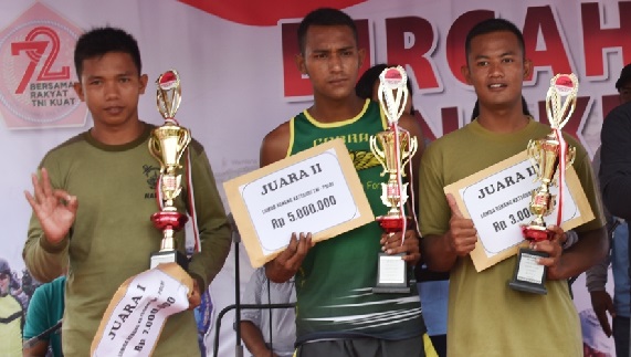 Prada Marinir Narto menyentuh garis finish pertama setelah berlomba mengalahkan 144 peserta kategori TNI – Polri dengan jarak 1.000 meter, disusul urutan kedua dari TNI AD yakni Prada Stevanus Bagus dari Yonif 731/Kabaresi. Sedangkan finish ketiga kembali diraih anggota Yonmarhanlan IX Prada Marinir Ragil F. Tohit dan Juara harapan I diraih Serma Syamsul Bahri dari Lantamal IX serta Juara harapan II diraih oleh Kopda Dinan Wagolo dari Denkav V/BLC.